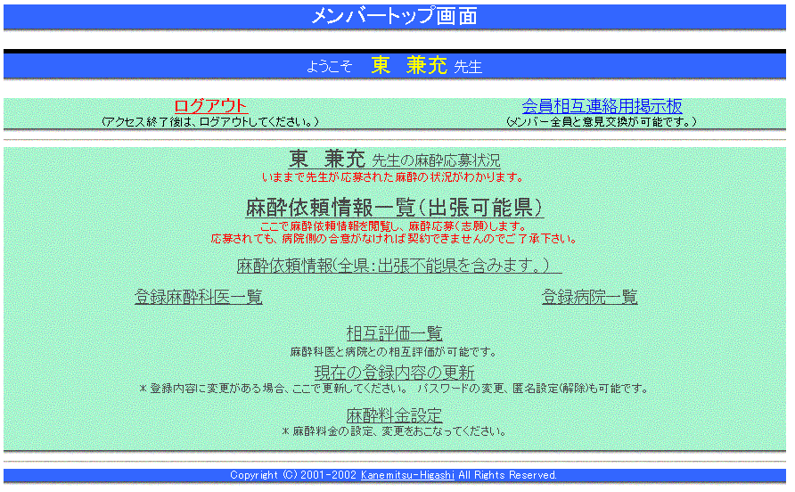 | 入力確認後、申し込みボタンを押していただくと、該当県の麻酔科医全員に麻酔依頼のメールが送信されます。 病院名が匿名でも、メールには、病院名が表示されます。 麻酔科医から、麻酔センターに応募があれば、応募メールが病院宛に届きます。 応募があっても、病院側が応募麻酔科医にご満足できない場合は、契約されなくてもかまいません。 複数の応募があった場合は、病院側が麻酔科医を選択することになります。 この時、麻酔科医の専門医取得の有無や、いままでの麻酔実績(相互評価)を参照することができます。 匿名設定にしていない登録麻酔科医の場合、一覧で実名や電話番号がわかりますので、直接交渉することも可能です。 (病院側のメンバートップ画面です。見本ですから、動きません。) |