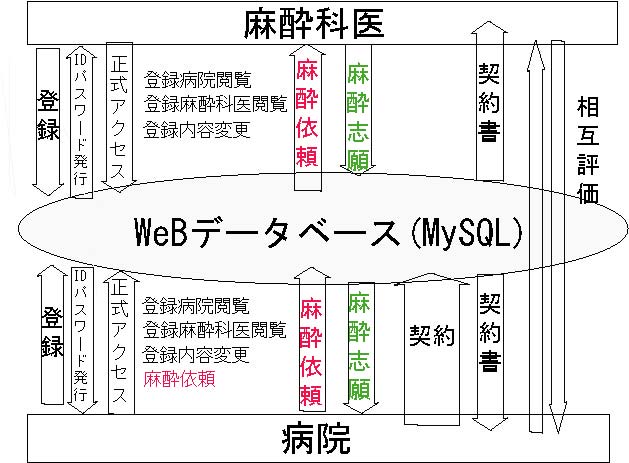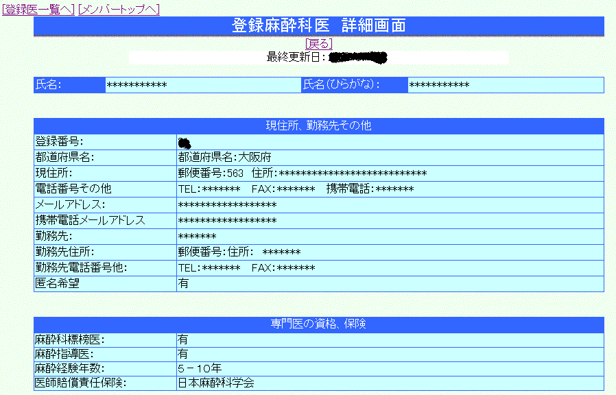 (登録および紹介料等かからず、守秘義務以外には、登録後の義務はありませんのでご安心下さい。) 登録がうまくきますと、パスワードが自動発行され登録確認メールがとどきます。 メールアドレスが、IDとなり、新たに自動発行されたパスワードを用いて、ログインすることができるようになります。 (すぐには、ログインできません。 管理側で記載項目のチェックを行い問題なければアクセス許可の設定をおこないます。) (アクセス許可後は、メールに記入された「IDとパスワード入りアドレス」から直接ログインすることもできます。) ログイン時は、麻酔科医か依頼病院かどちらかの選択ボタンを押して選択してください。 登録後も、ユーザーご自身で、登録内容の変更がいつでも可能です。 以下に、システムの概略を示します。 麻酔科医も麻酔依頼病院も、匿名の設定が可能です。 氏名(病院名)や住所、勤務先等が匿名となります。 この設定により、登録麻酔科医および登録病院一覧では、匿名表示(*****と表示)されるようになります。 (麻酔科医のメンバー詳細 匿名画面です。見本ですから、動きません。) *麻酔科医の先生方は、一応当方で日本麻酔科学会の名簿を元にお名前を確認させていただいております。 (万一名簿にお名前がない場合、メールか電話で確認させていただくことがあります。) |