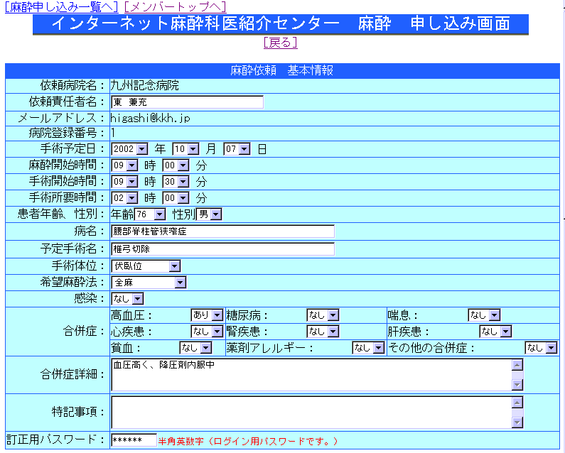 | 3、麻酔依頼の方法(病院側): 麻酔依頼画面(下図)で、麻酔依頼内容を記入していただきます。 |
