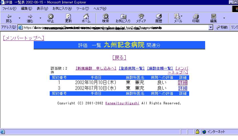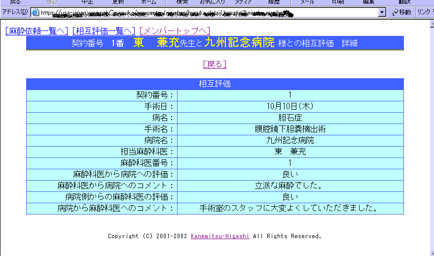 (麻酔科医側のメンバートップ画面です。 見本ですから、動きません。) 5、麻酔科医の選択と契約(病院側) 麻酔科医から麻酔応募メールが届きましたら、再度当センターにアクセスしていただきます。 (麻酔応募メールから当センターへ直接アクセスできるようにしています。) 麻酔依頼一覧から、麻酔契約画面に移動していただき、麻酔科医を選択します。 この際、その麻酔科医の専門医取得や保険加入の有無、麻酔実績(相互評価:下図)をみて選択の参考にします。 |